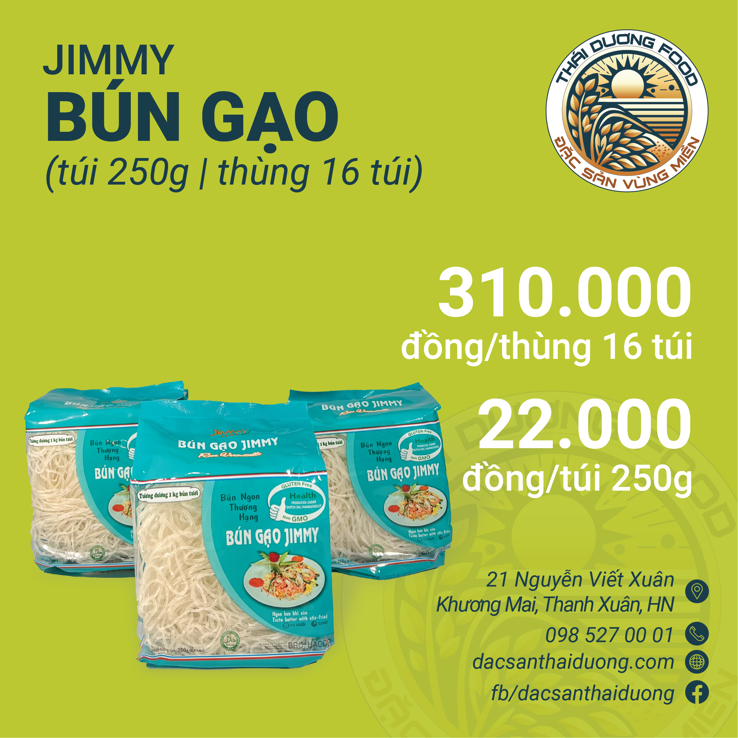 Lấy sứ mệnh tôn vinh giá trị hạt gạo Việt làm trọng tâm phát triển, Jimmy Food đã và đang nhân rộng mô hình vùng nguyên liệu sạch, hỗ trợ người nông dân về mọi mặt, bao tiêu sản phẩm, đầu tư máy móc và trang thiết bị hiện đại kết hợp với quy trình sản xuất khép kín chuẩn quốc tế. Nền tảng khoa học vững chắc, nguồn nguyên liệu sạch, cơ sở vật chất hiện đại, đội ngũ nhân viên chuyên môn cao, là nền tảng để Jimmy Food tạo ra những sản phẩm Bún gạo Jimmy 250g an toàn nhất cho sức khỏe người tiêu dùng.