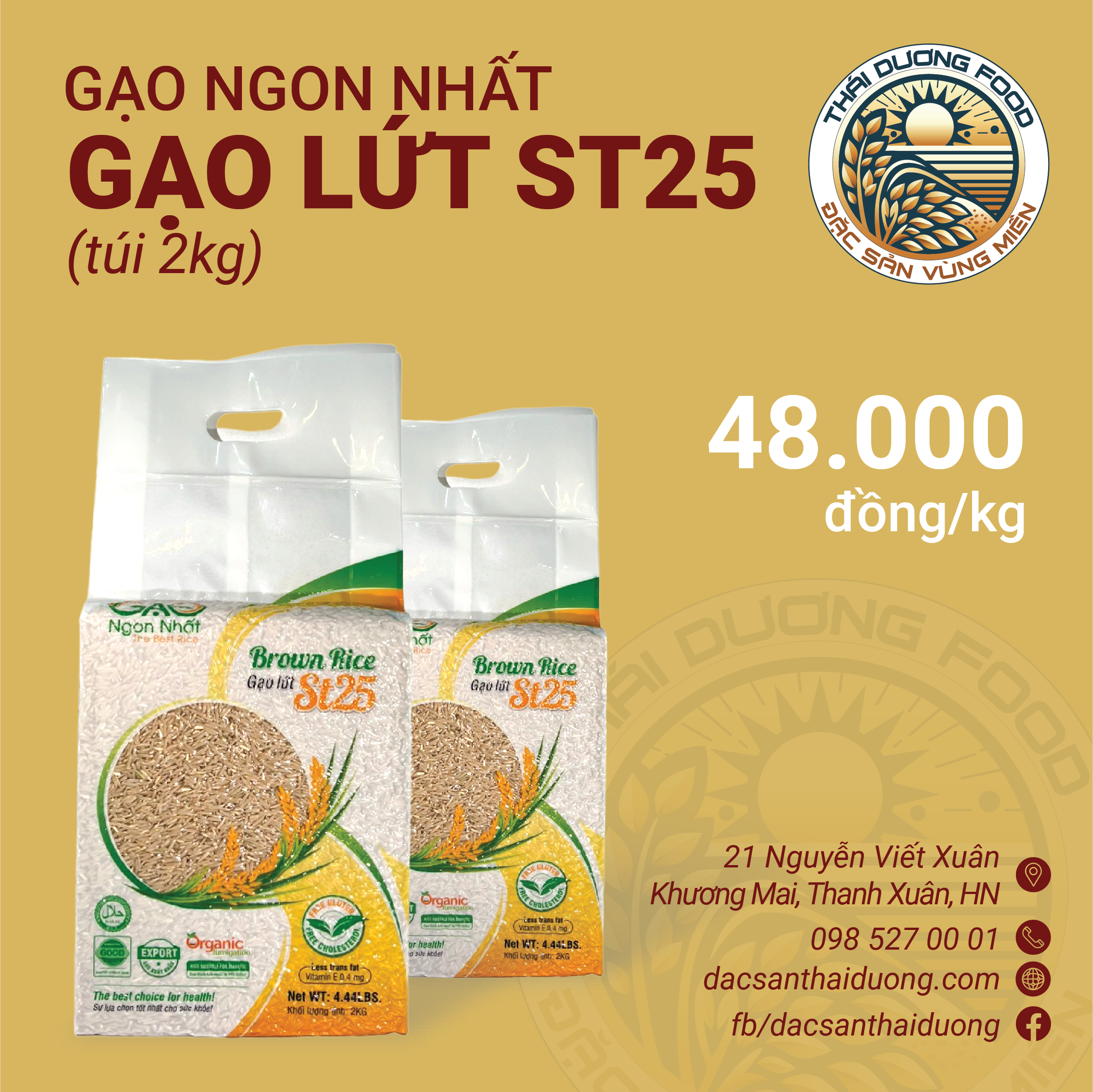 - Đặc tính: Gạo Lứt ST25 là gạo nguyên cám ST25, không có thuốc bảo vệ thực vật, được trồng tại Sóc Trăng – Việt Nam. Khi nấu chín cơm mềm dẻo & thơm, gạo lứt ST25 giàu chất dinh dưỡng protein cao – vitamin E & khoáng chất như Kali, Magie, Canxi,…. Rất phù hợp cho người bị đái tháo đường, tim mạch & vận động viên thể thao. Gạo không có hóa chất, không chất tạo mùi, tẩy trắng, không chất bảo quản.